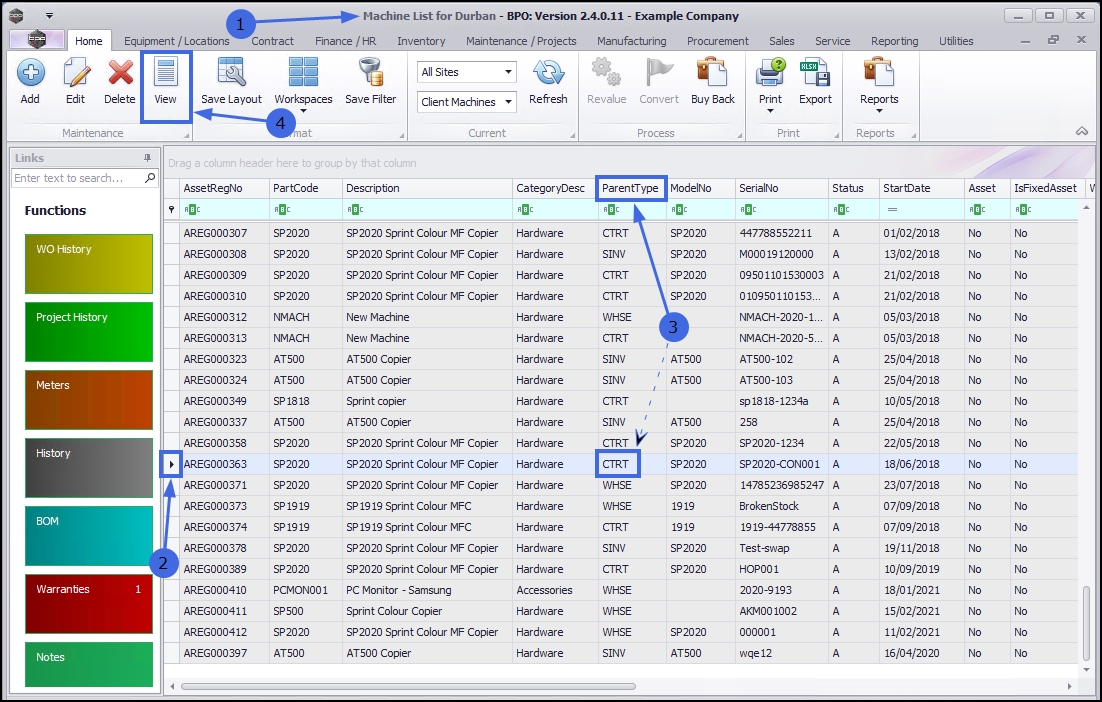 The View button in the Asset Listing screen (Machine List for [ ] screen) allows you to view more details with regards to a selected asset.