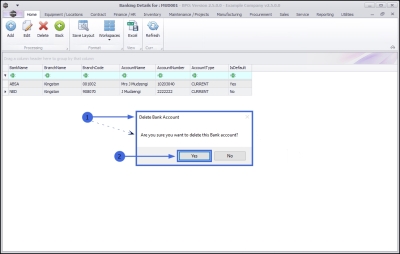1. A Delete Bank Account message box will pop up with the following prompt: