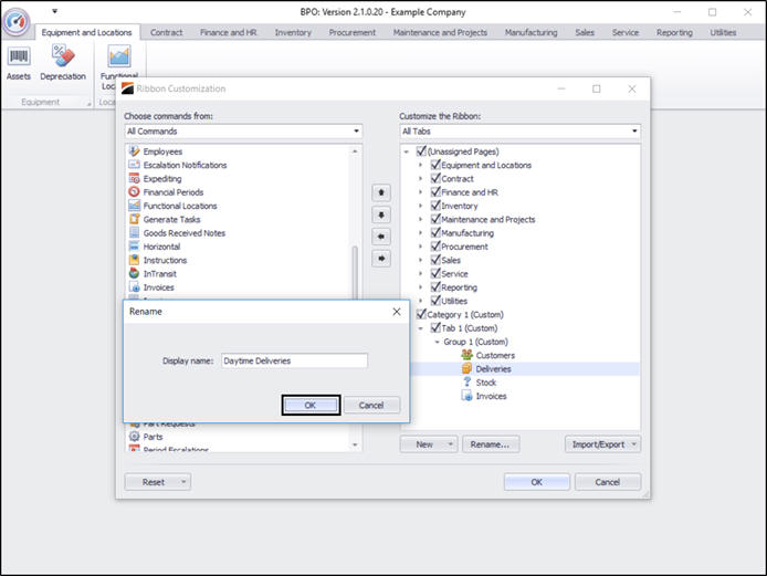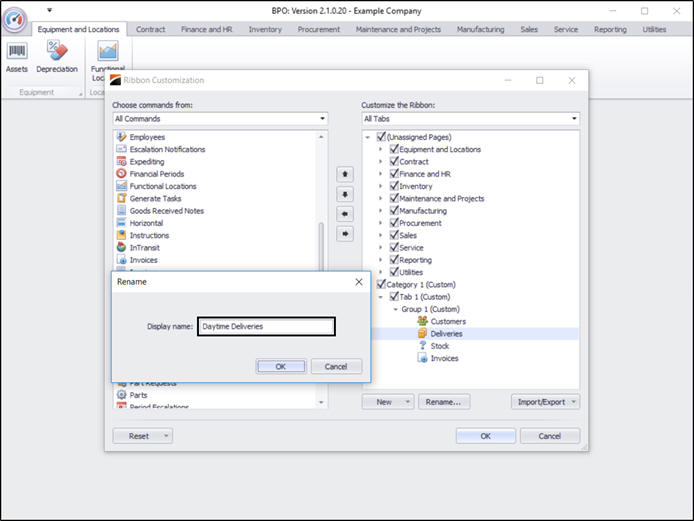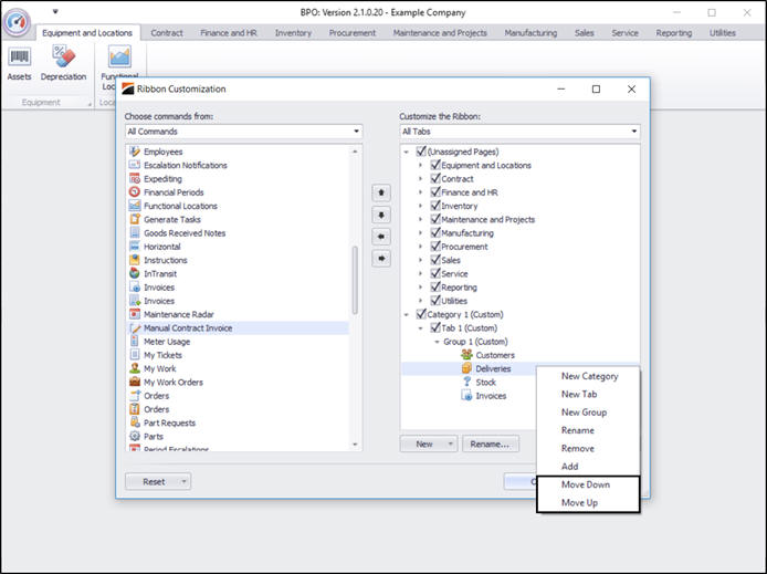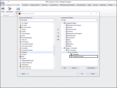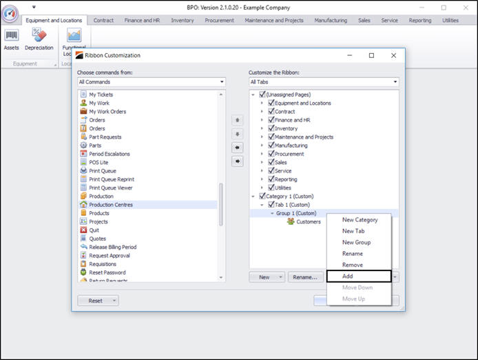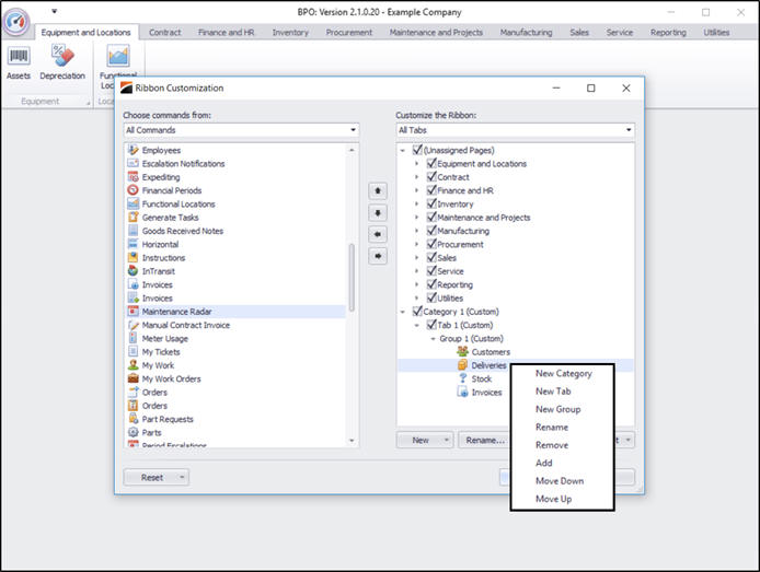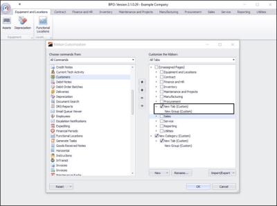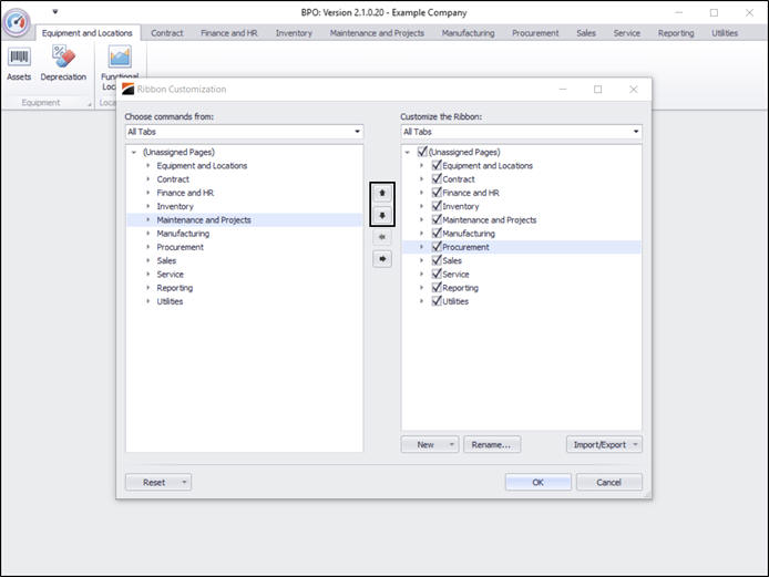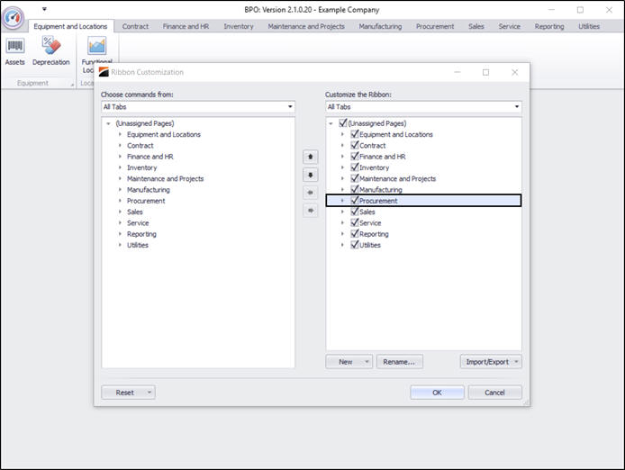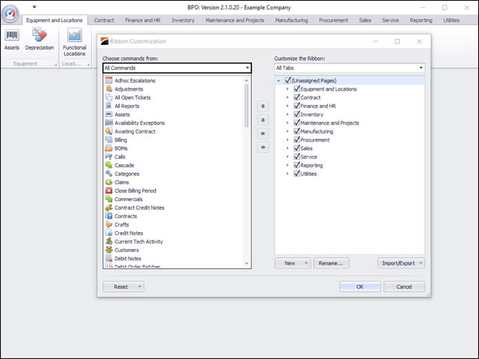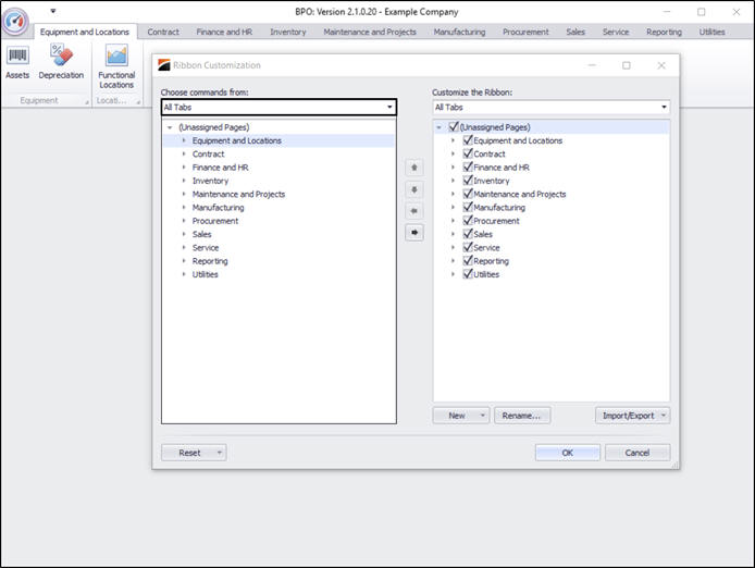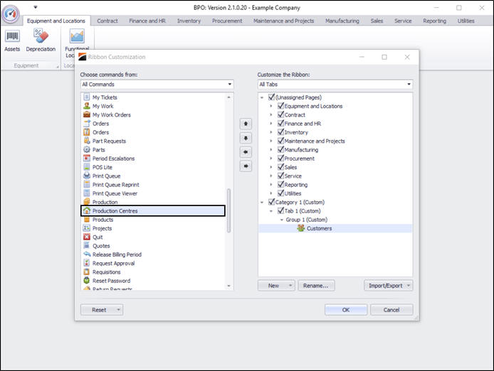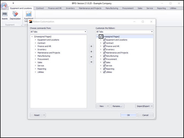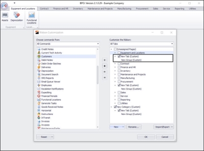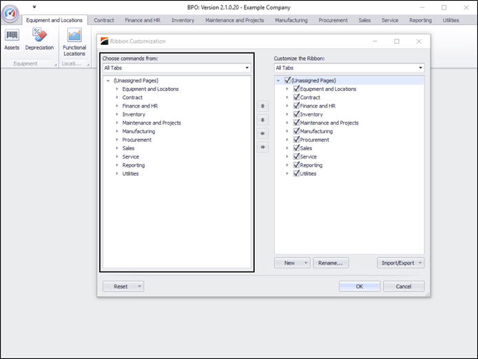 - The left-hand side of this screen is the Choose commands from: menu which contains a list of all the Tabs and Commands available in BPO2.