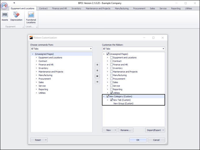 - The New Category, New Tab and New Group have (Custom) after their titles to let you know that they are your customized additions to the list.