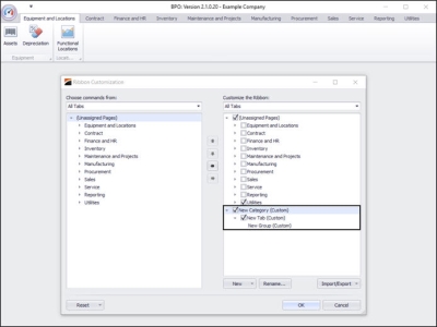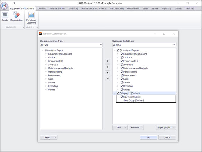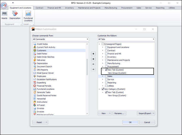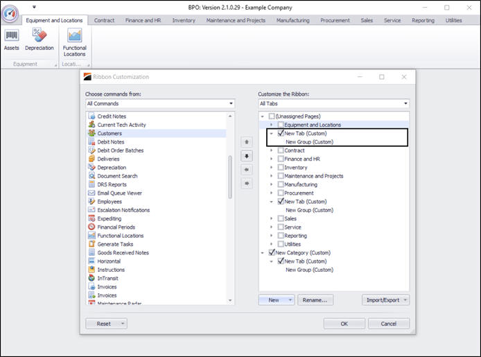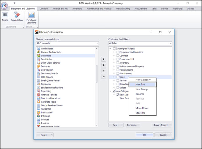 - In this image, the New Tab (and New Group) were added below the Equipment and Locations Tab which was highlighted.