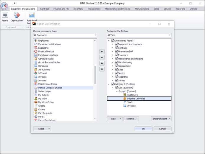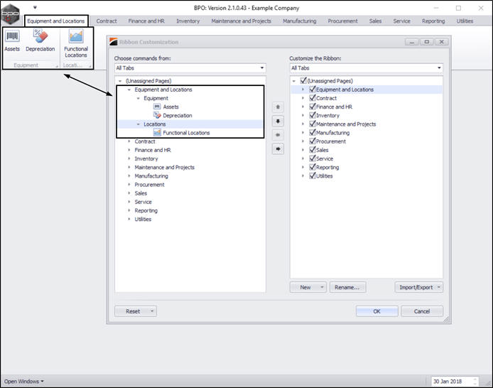 - You will see that this is a list reflection of your Equipment and Locations ribbon tab and its commands as currently displayed in the ribbon.