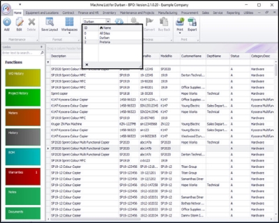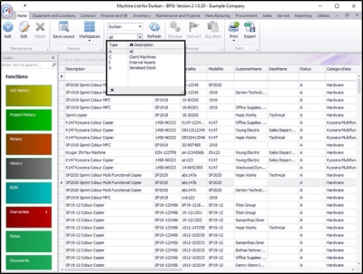 • The Status or Type Filter allows you to filter the information in the screen according to status / type. This is only available in some screens and its content depends on the screen that you are currently in. In this image we are searching for a particular status in the Asset Listing (or Machine List for Durban) screen.