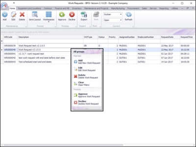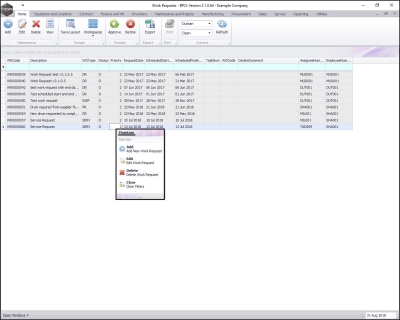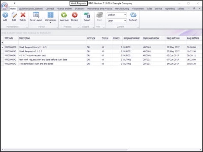 • The Work Requests listing screen will be displayed, and the Active Title Bar will now display the title of the selected ribbon toolbar icon as well as the software version and company name.