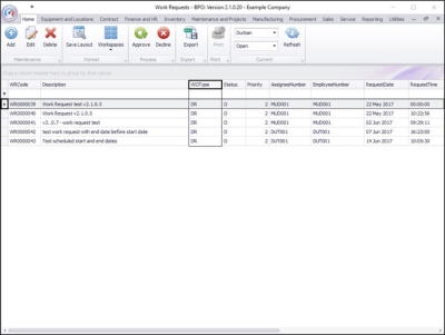 • In this example, the data grid contains rows and columns with information relating to the Work Requests ribbon toolbar icon.
