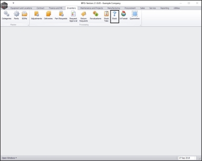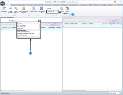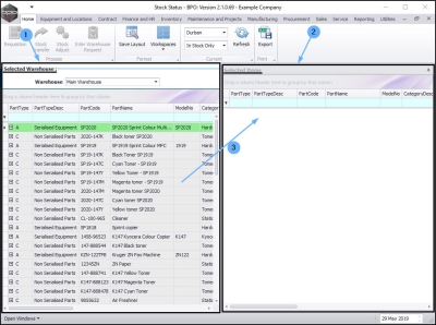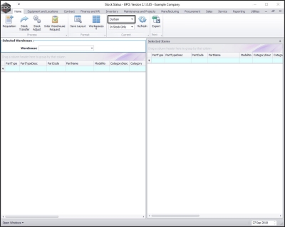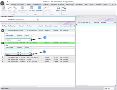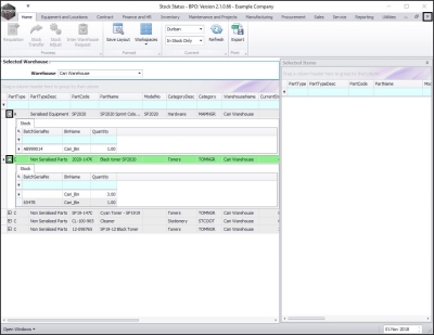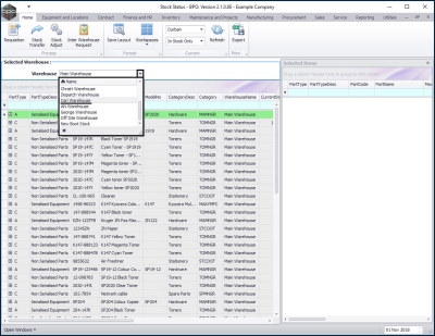 - The Selected Warehouse frame will now be populated with the stock details of all the parts/equipment items linked to that warehouse.