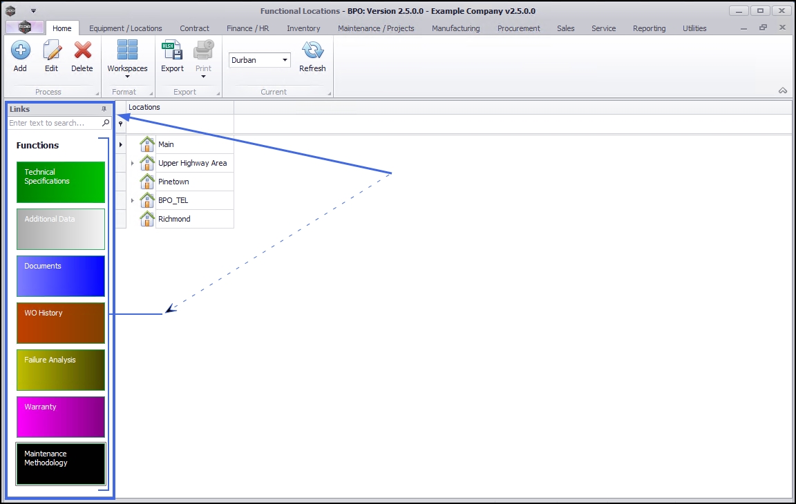 On the left side of the Functional Locations screen is the Links panel which contains the locations Functions tiles. Each tile, when clicked on, will take you to further information concerning the selected location.