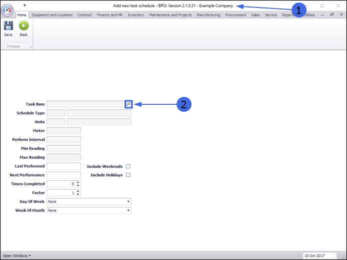 - The Schedule Type, Units, Meter, Min Reading, and Max Reading fields will populate automatically according to your Task Num choice.
