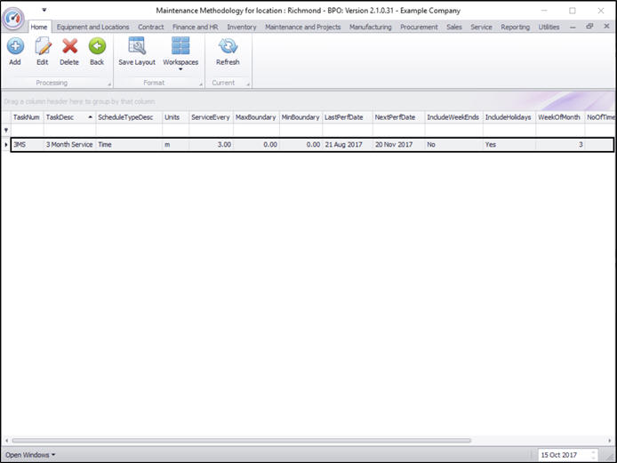 - You can now view the new Maintenance Task in the Maintenance Methodology for location: [] screen.