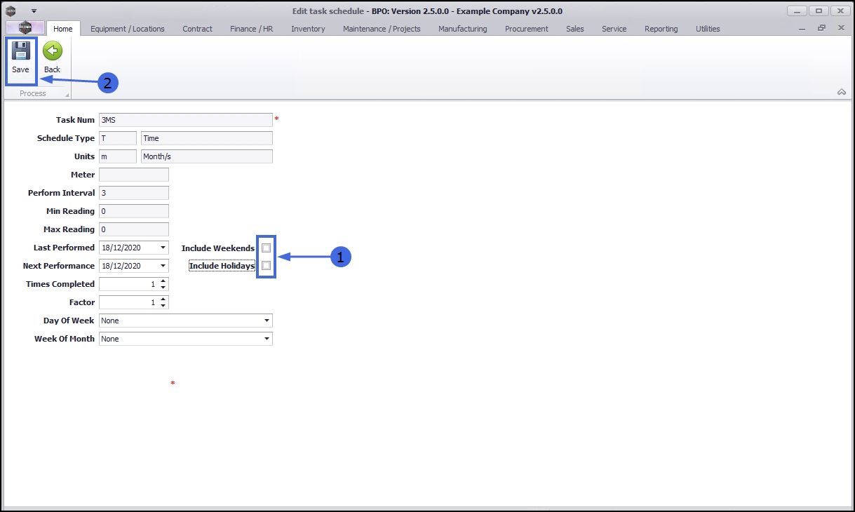 - In this example, both the Include Weekends and Include Holidays check boxes have now been deselected, indicating that tasks can no longer be performed on those days if the scheduled task date should fall on either a Saturday or Sunday or on a public holiday.