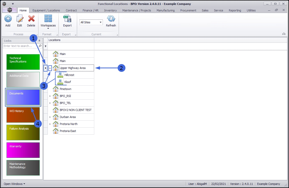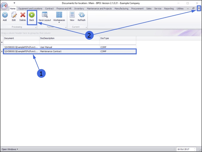 - If the documents are to be linked to a main location, select the row of that main location. In this example Upper Highway Area is a main location.