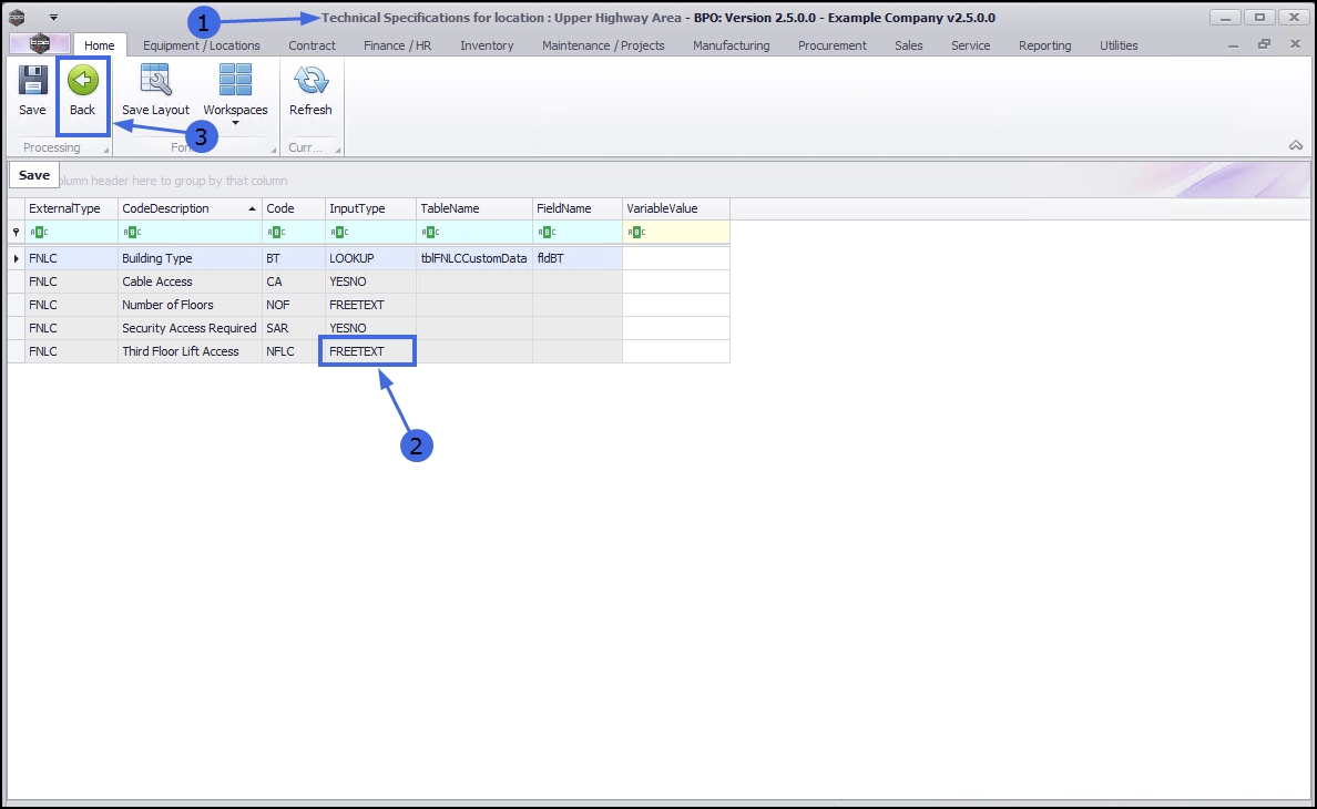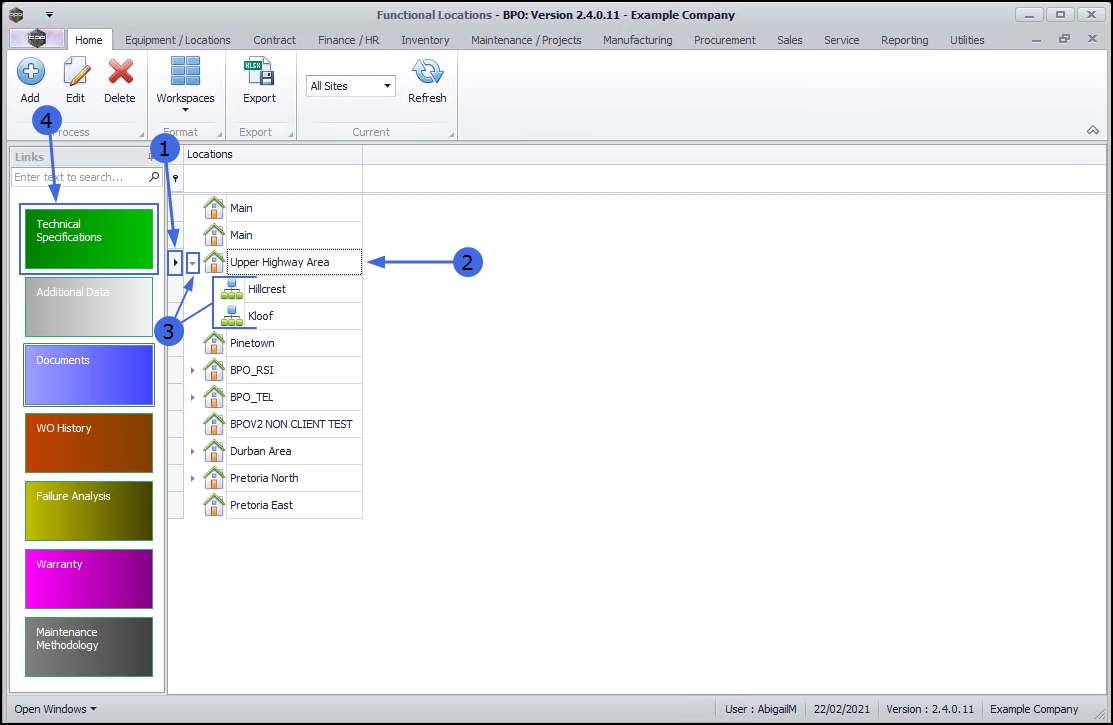 - If you wish to view the Technical Specifications of a main location, select the row of that main location. In this example Upper Highway Area is a main location.