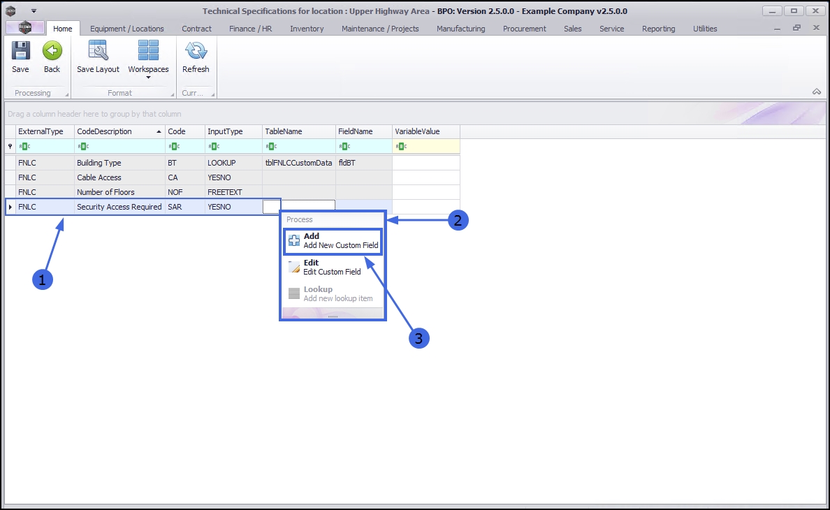 - There is no Add or Edit processing button as this screen utilises the right click functionality.