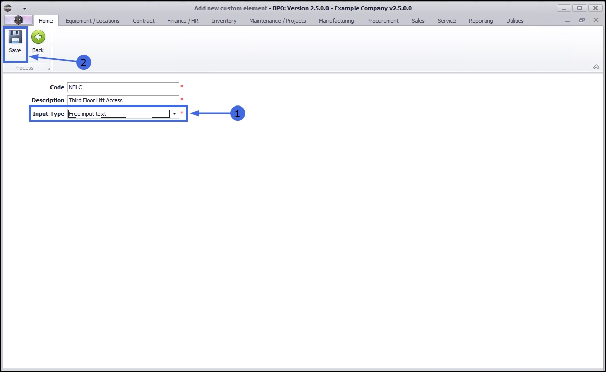 - Input Type: Type in the input type for this element e.g. Free input text, Lookup list, Yes or No value.