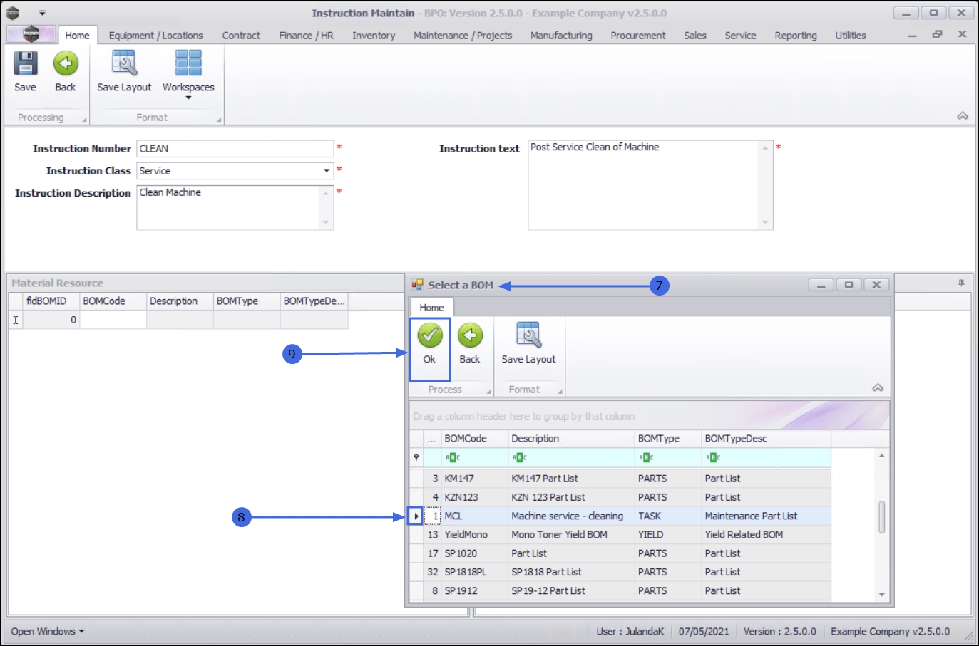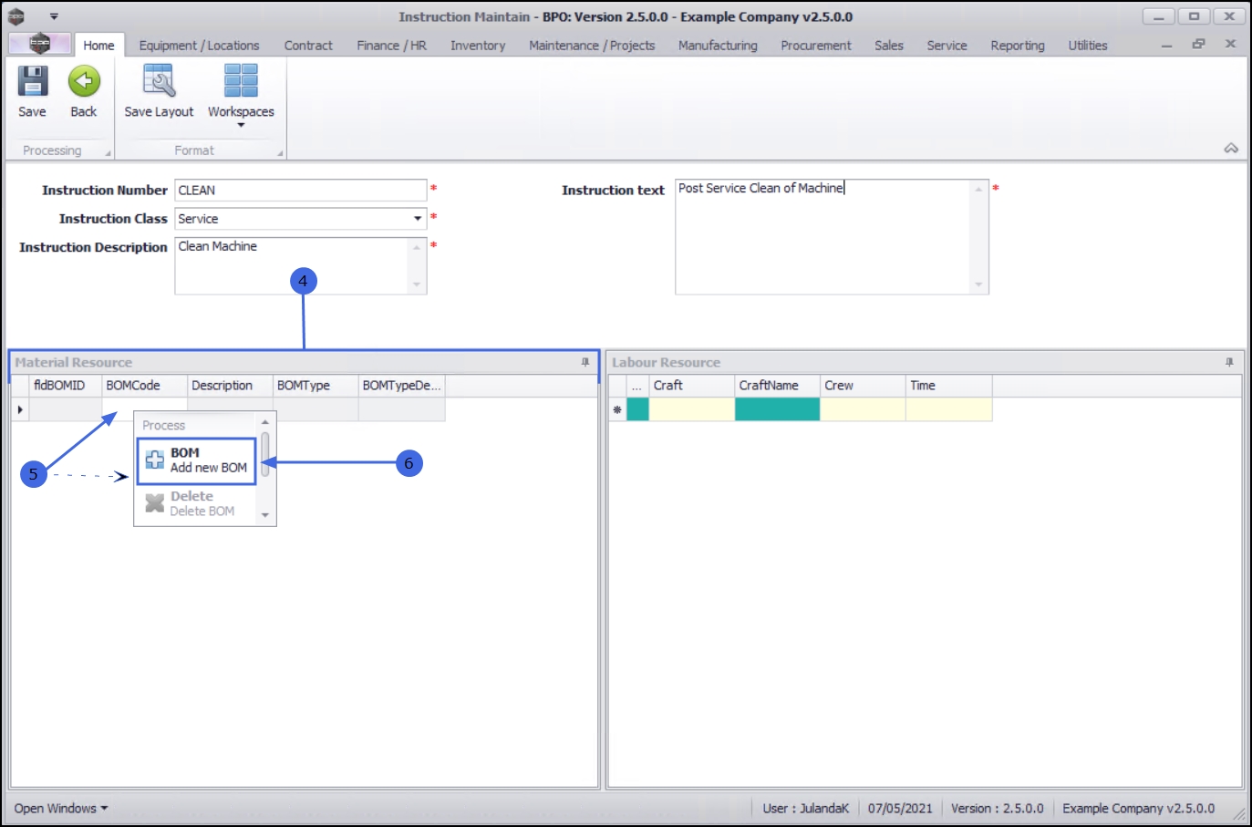 Note that you can add more than one BOM (material resource) to an instruction. - Continue adding BOM details as required.