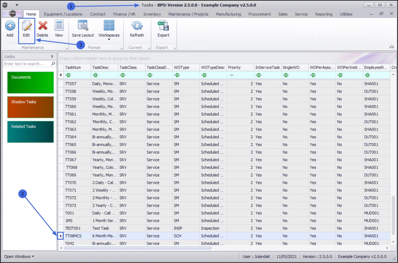 | Ribbon Access: Maintenance / Projects > Tasks |