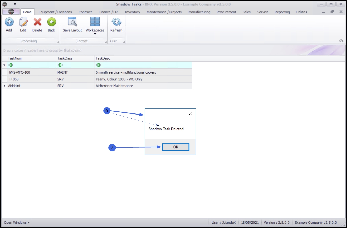 - The Shadow Tasks screen will be updated and the Shadow Task you have removed will no longer be visible in the task data grid.