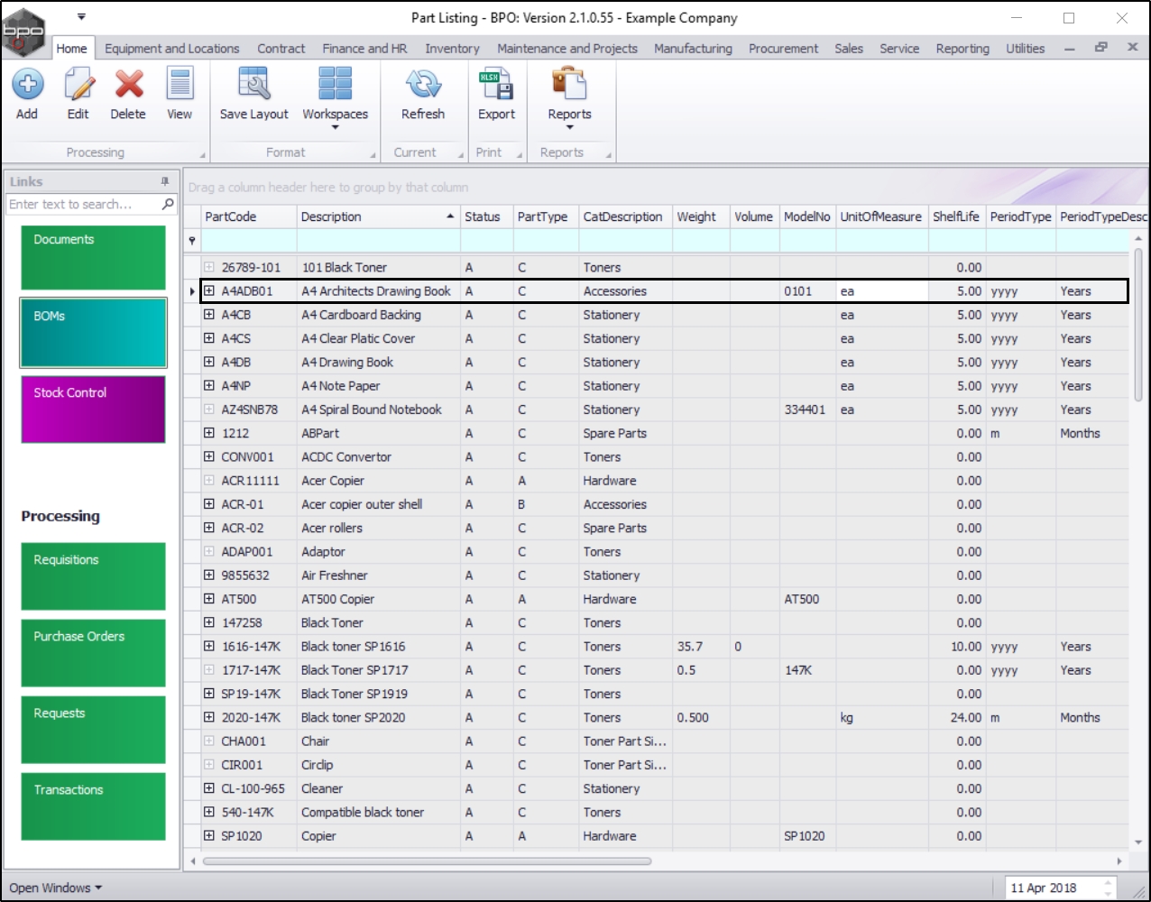 Before a part can be manufactured using the BPO Manufacturing module, Inventory definitions need to be set up for the Part that will be produced, and the parts required for the production process. These are set up in the BPO Inventory module.