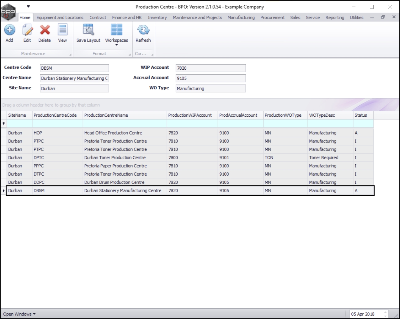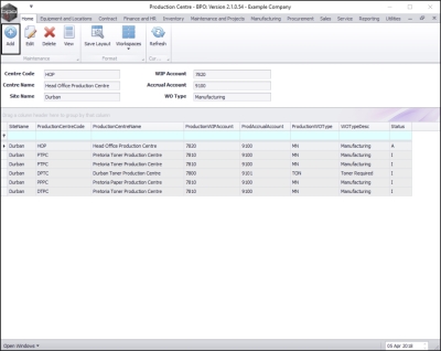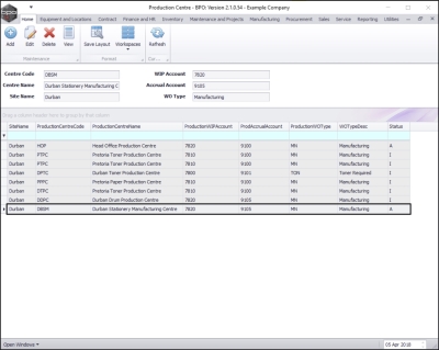 - Here you can view a list of all the production centres currently set up on the system.