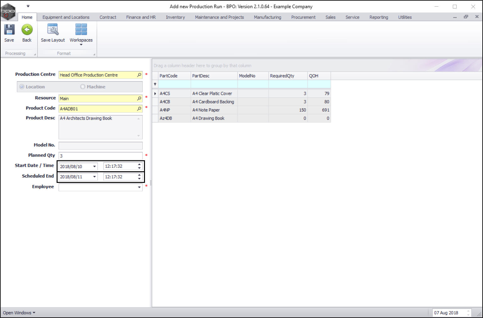 - When you have selected the Planned Quantity amount, the Parts data grid will now populate with the Required Quantity needed to complete the production run.