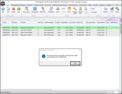 - You will return to the Part Requests for Work Order Code [] screen and a Part Request Processing message box will pop up advising the following: