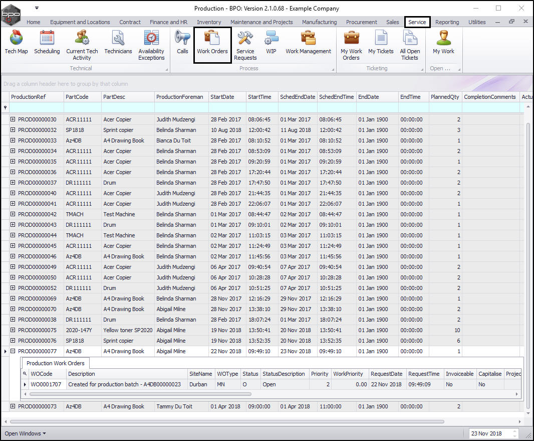 - Now navigate via the Service tab, to the Work Order listing screen.