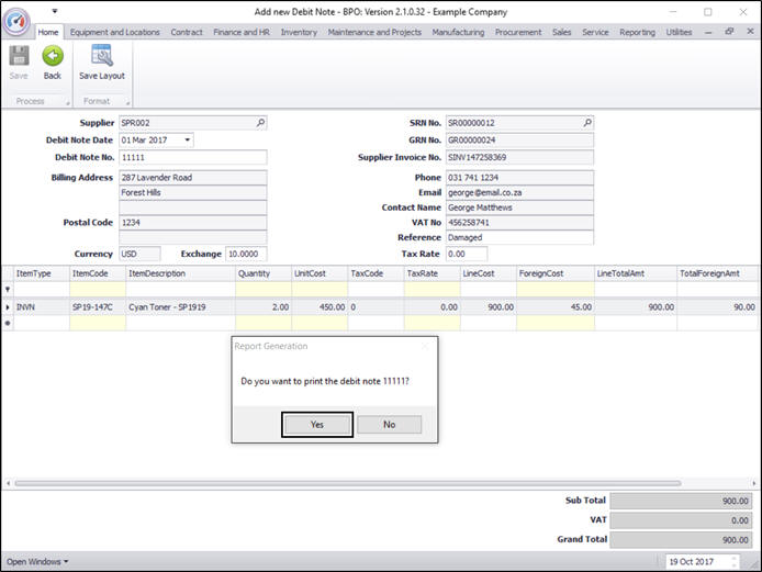 - Items: The Debit Note items will pull through from the Supplier Invoice details.