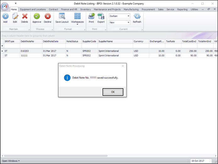 - A Debit Note - Process message box will pop up informing you that;