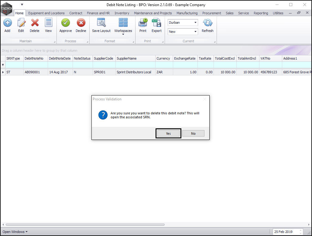 - Are you sure you want to delete this debit note? This will open the associated SRN.