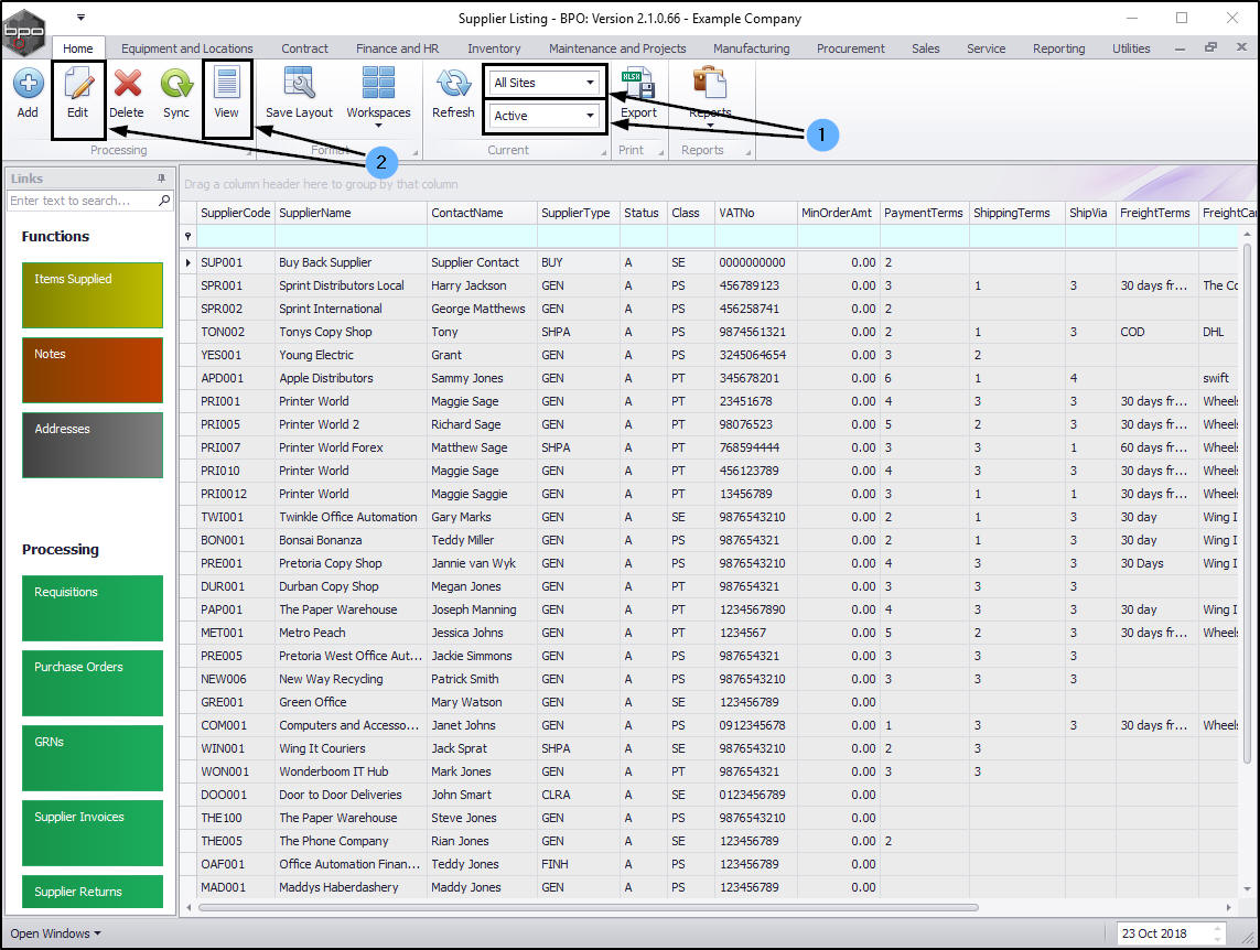 - You can View any supplier in this status but if you wish to Edit a Supplier you must select a site first. (The system will prompt you to do this).