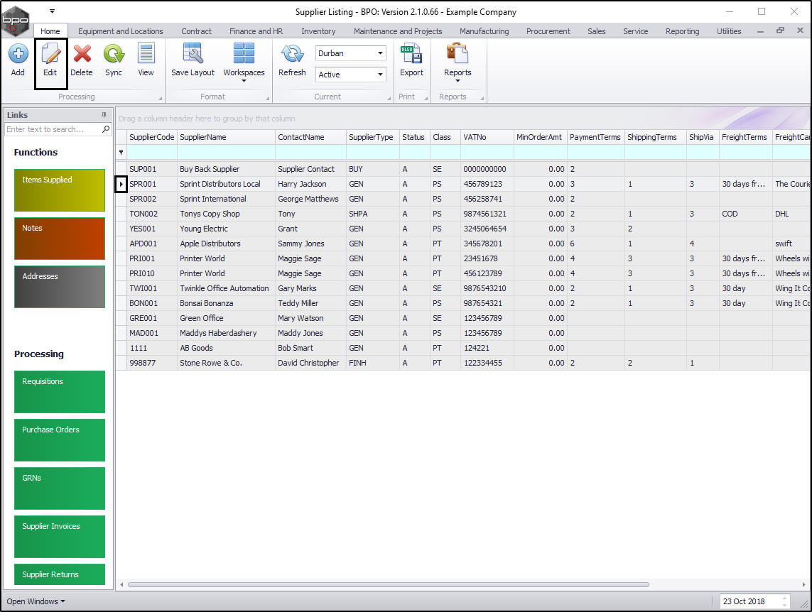 - Click on the row selector in front of the supplier that you wish to edit the details of.