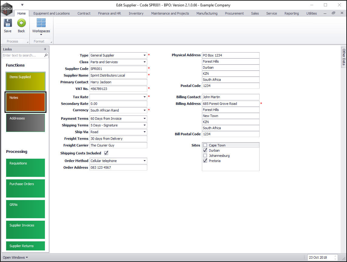 - In the Edit Supplier screen, click on the Notes tile.
