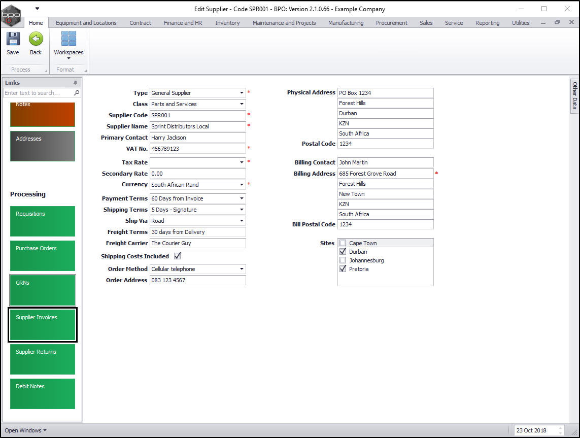 - Close the screen to return to the Edit Supplier - Code [ ] screen.
