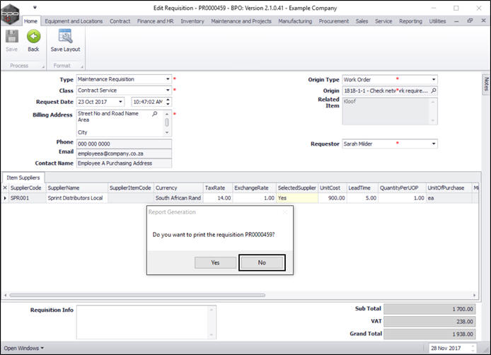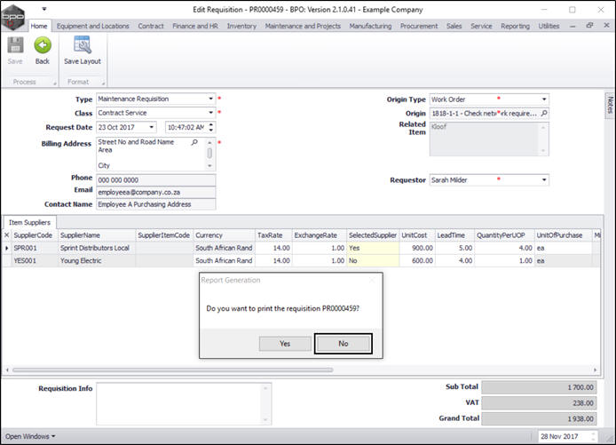 - Follow the directions as above if you wish to click on Yes to print the requisition.