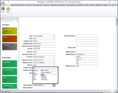 To create a purchase order, an Order Method must be set up on the supplier, this will be the preferred method of ordering items and/or services.