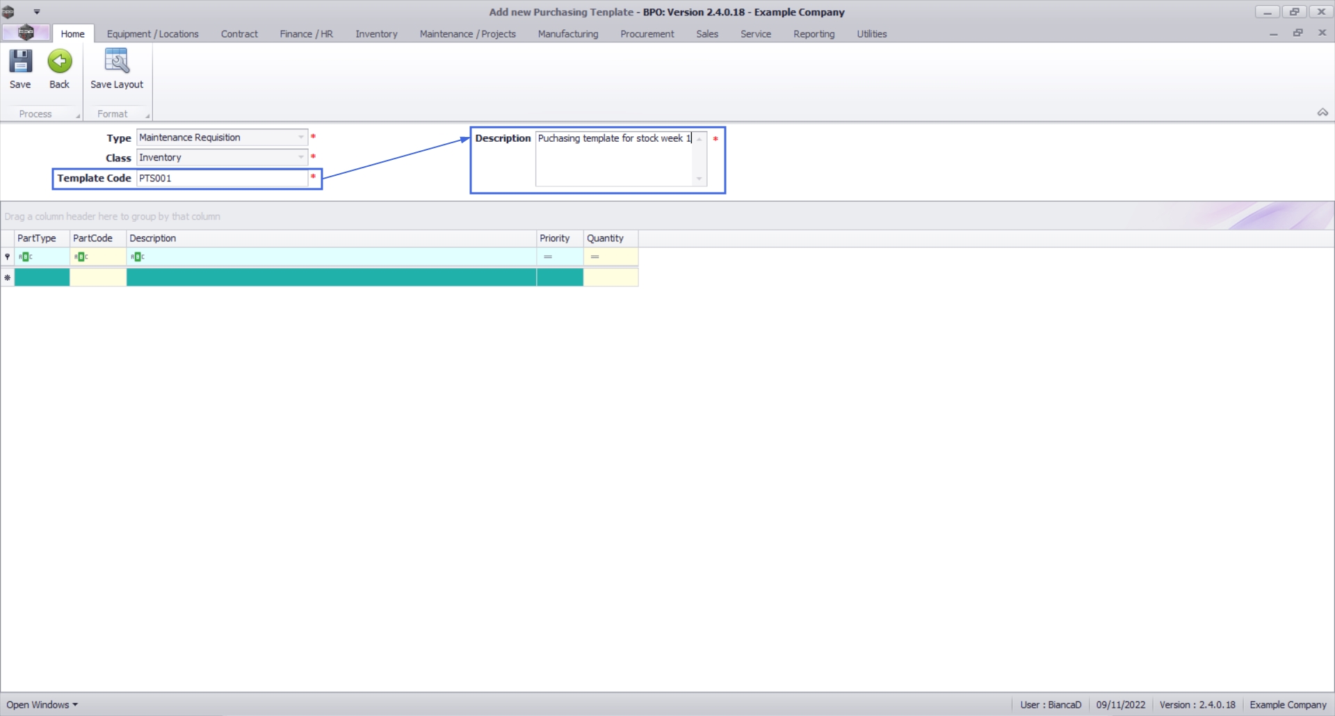 The Purchasing Template Maintain screen will open with the Type and Class pre-populated as noted below. These values cannot be changed.