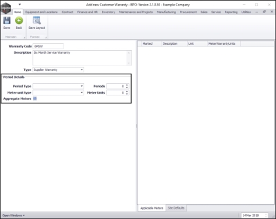 - Note: If Meters are not required to be linked to this warranty - move on to the Site Defaults frame at this point.