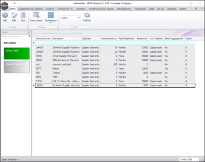 You can add any warranty that is placed on an item that you have received from a supplier, and link that warranty to the item. Follow the process below to add a new warranty definition to the system.