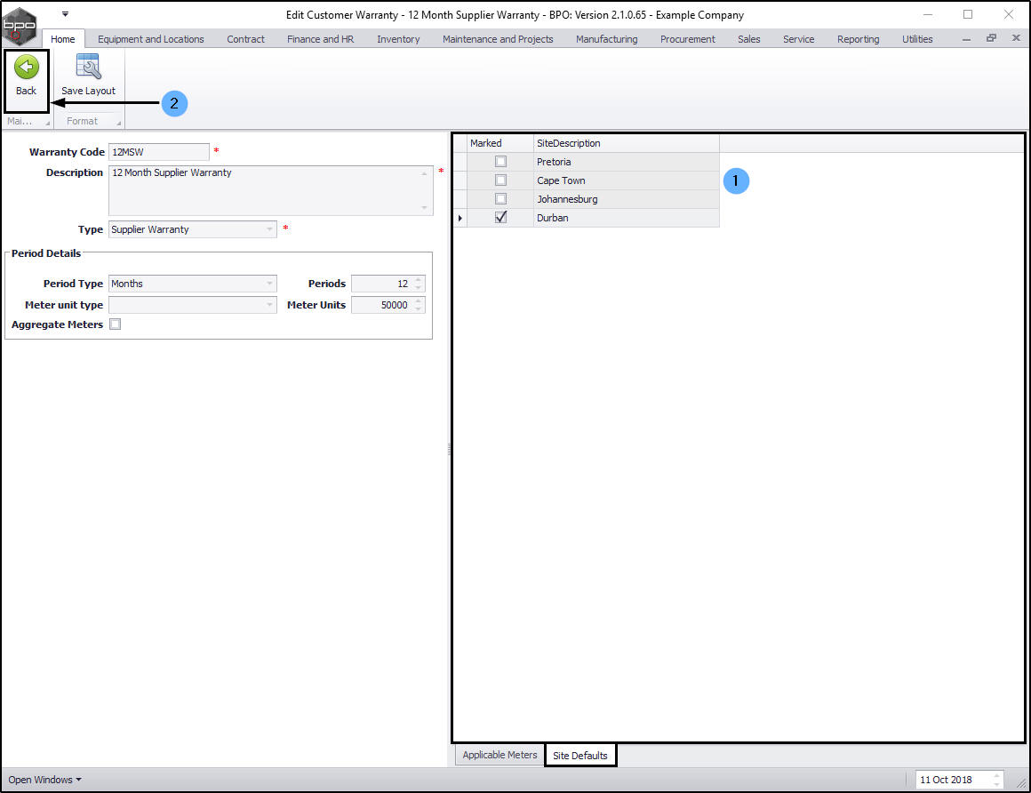 - Click on Back to return to the Warranties listing screen.