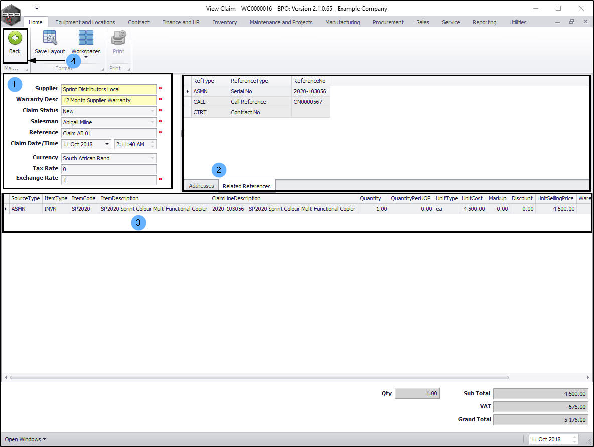 - Click on Back to return to the Warranty Claims screen.