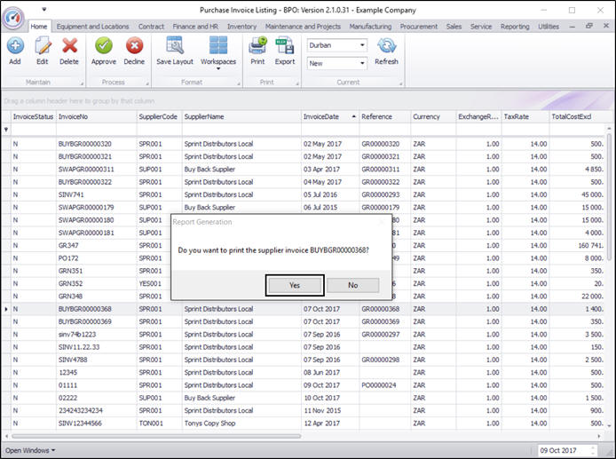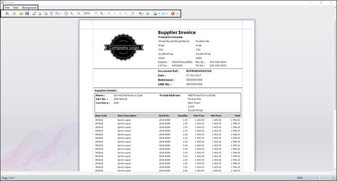 - Click on the row selector in front of the supplier invoice you wish to print.