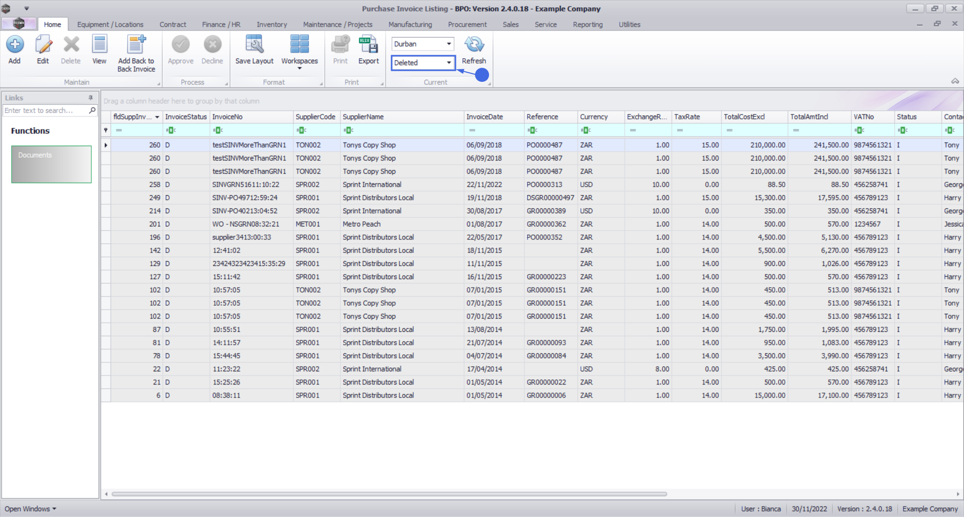 The Supplier Invoice can be found by selecting the Deleted status filter.