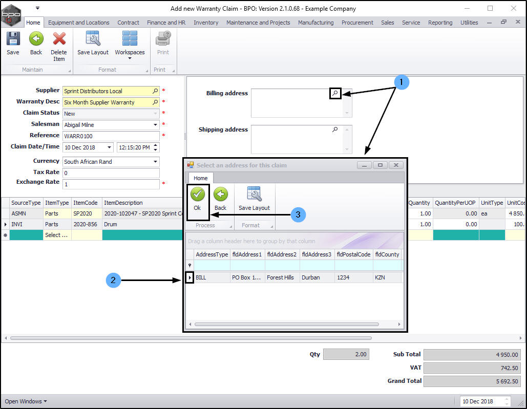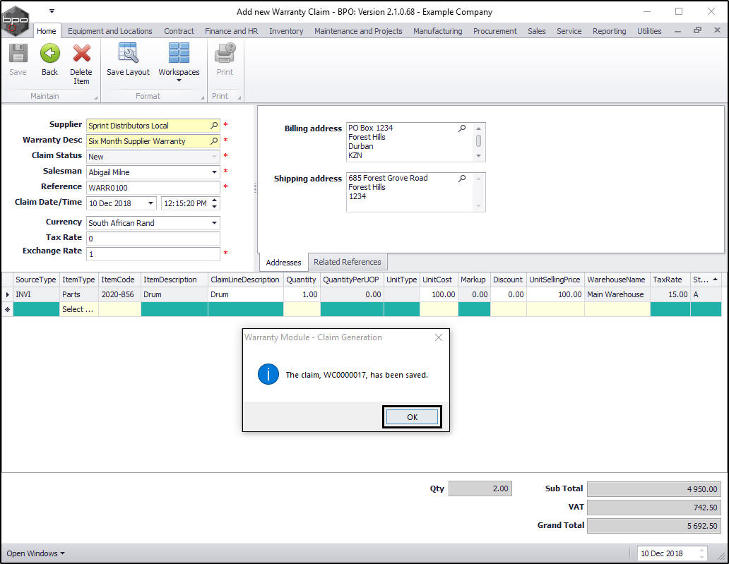 - A Warranty Module - Claim Generation message box will pop up informing you that;