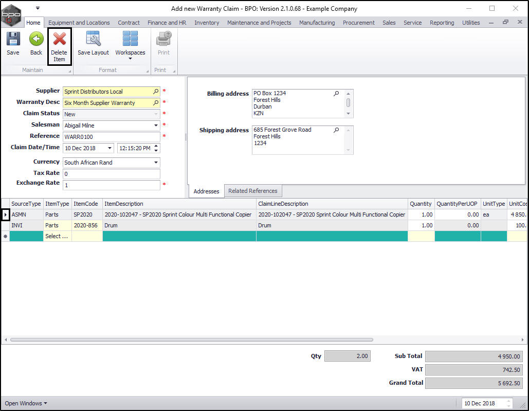 - The new warranty claim will display in this screen