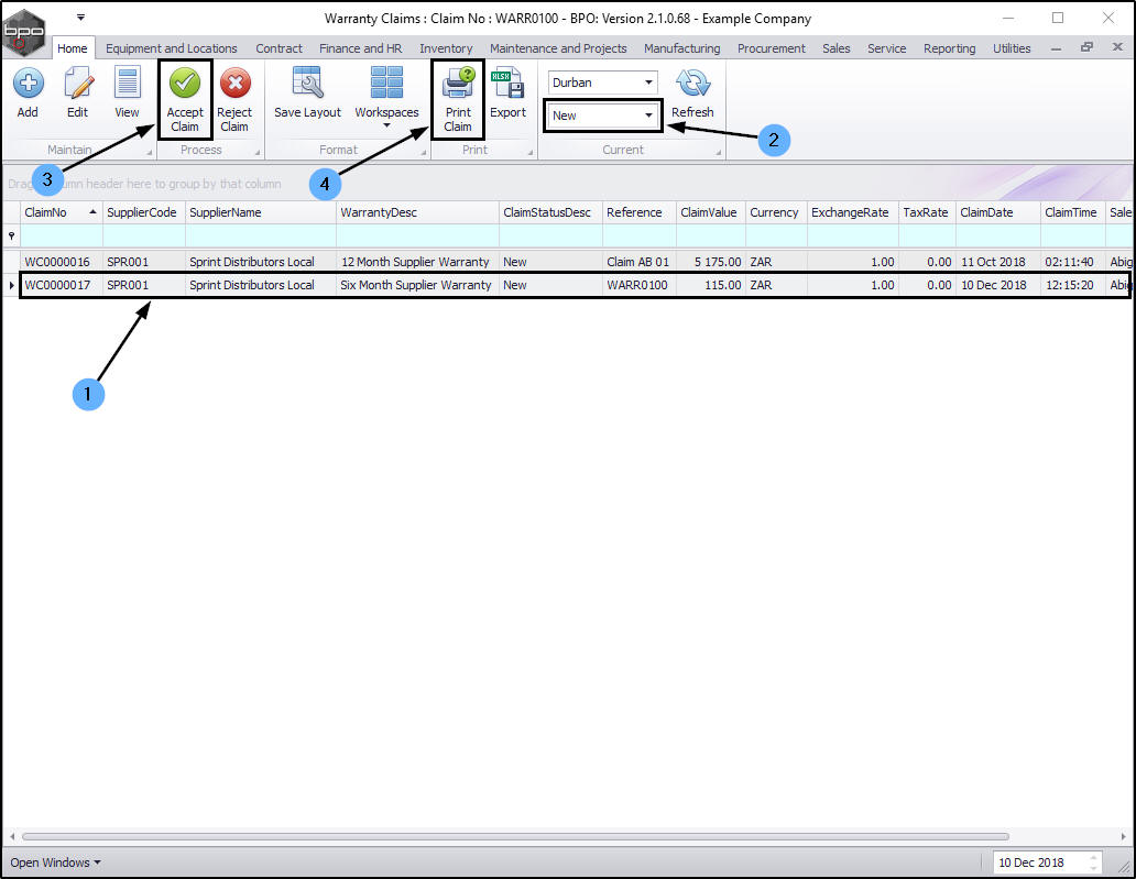 The Warranty Claims listing screen will be displayed.
