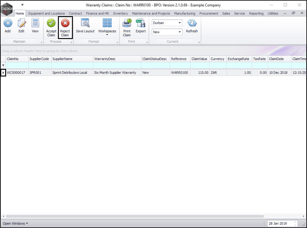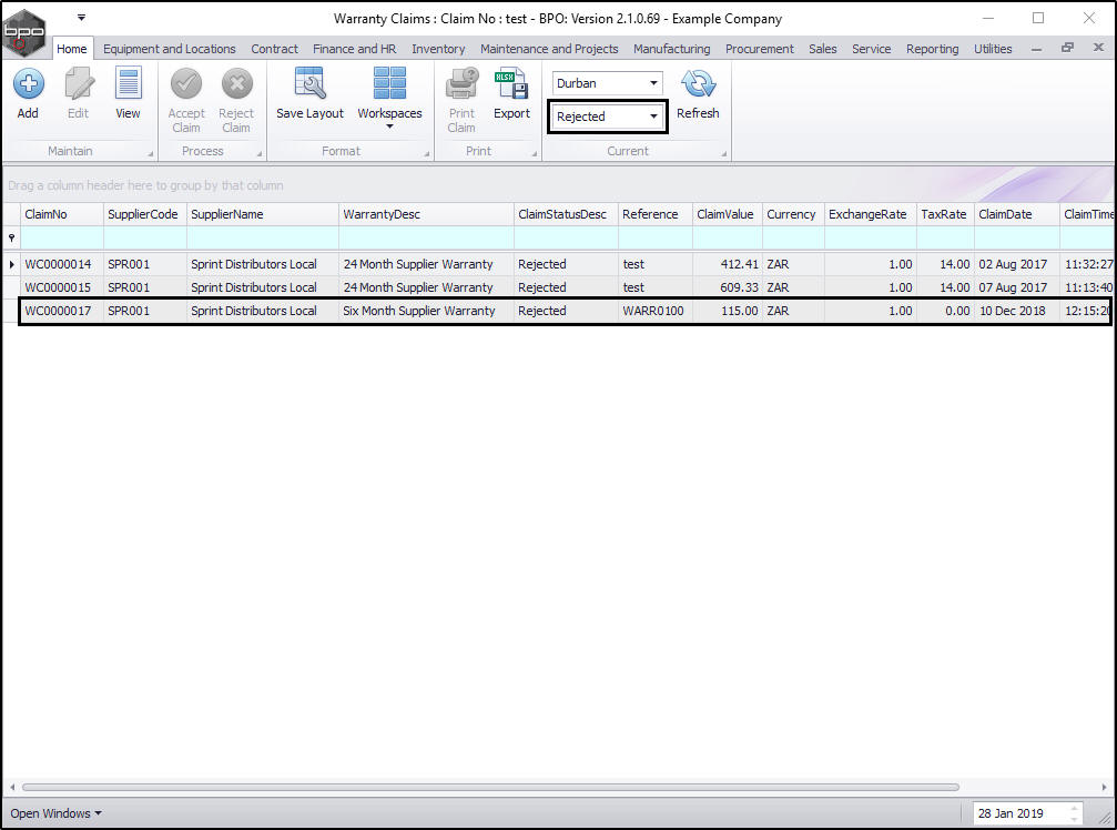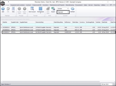 - The claim can now be found in the Warranty Claims: Claim No: [ ] screen where the status is set to Rejected.