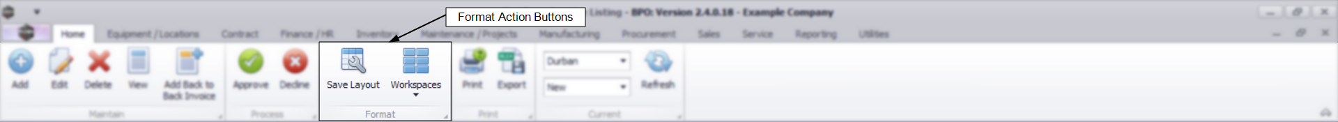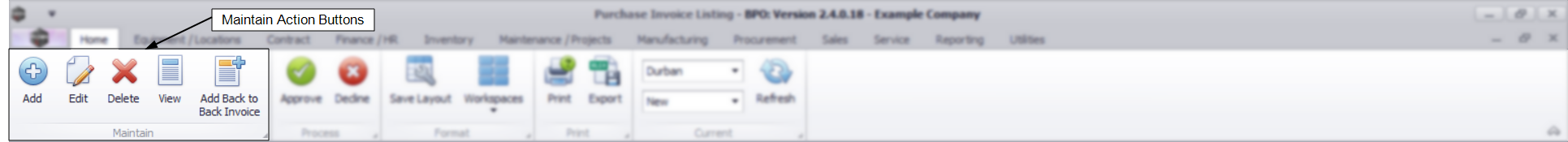 The ribbon action buttons will be available (bold) or unavailable (greyed out) depending on the status selection, and security right access level. The following functionality is available from this screen: