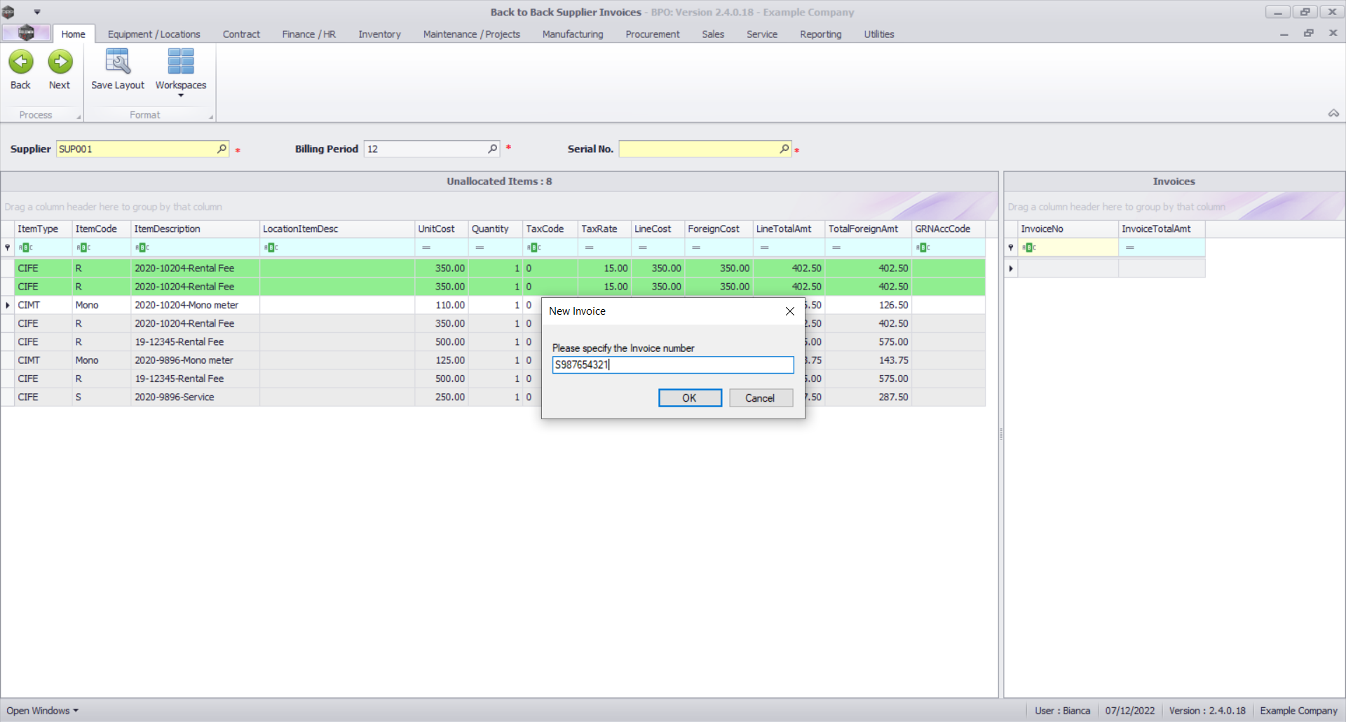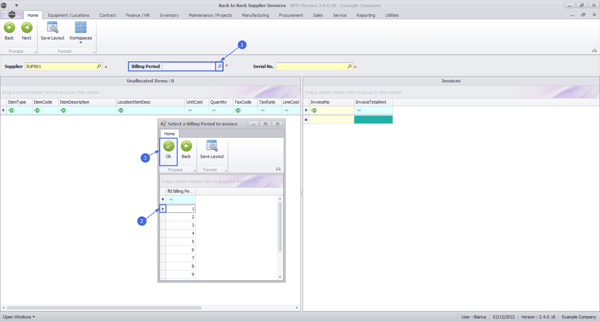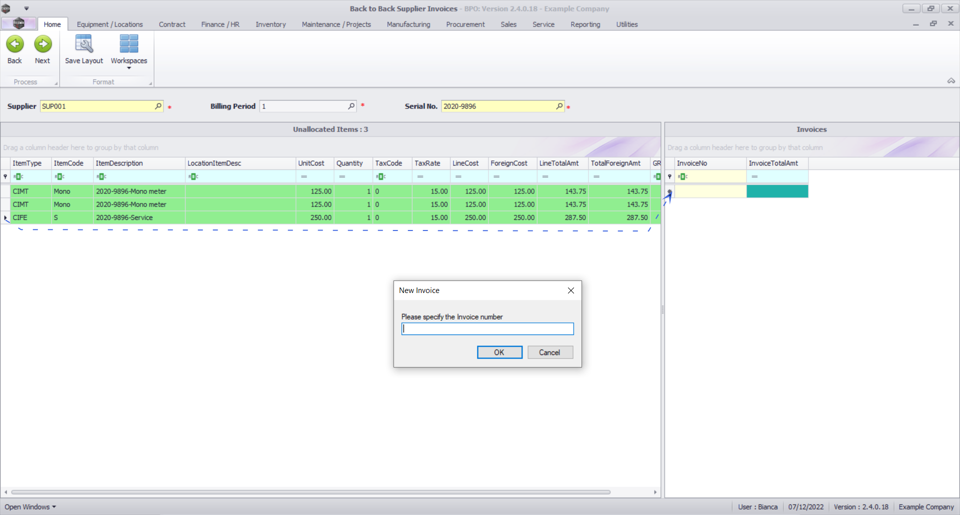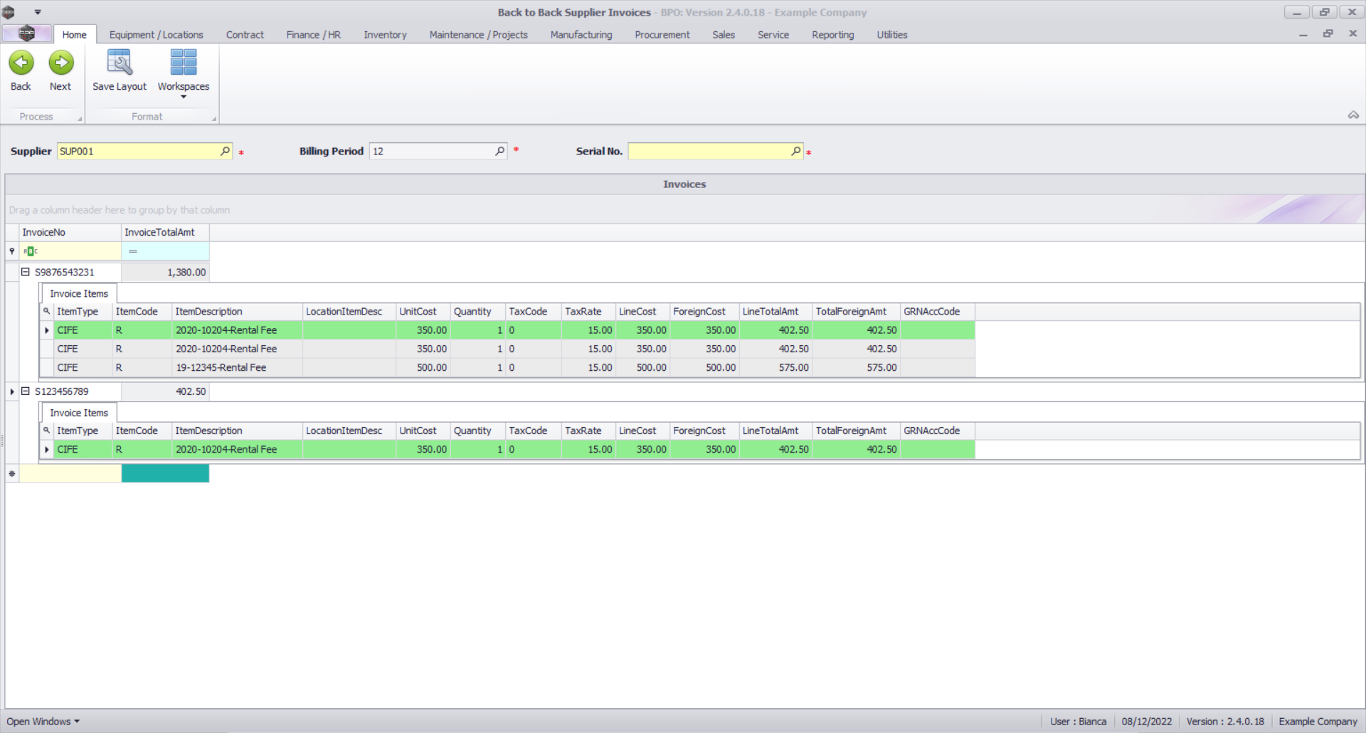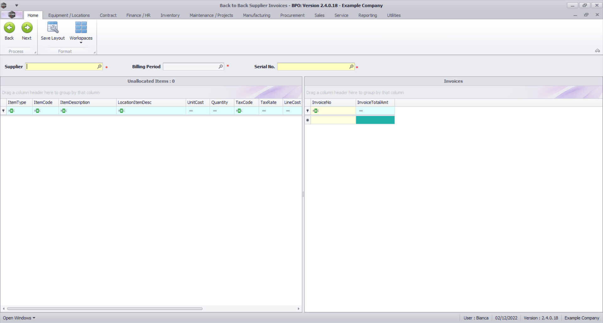 The Back to Back Supplier Invoice maintain screen will be displayed, where the Supplier / Finance Party and Billing Period must be selected. You can optionally further filter the items by Serial Number.