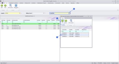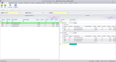 The screen contains two data grids - the right grid will contain the Invoice Header where you will be prompted for an Invoice Number and the left grid contains a list of the available fee and / or meter line items, which populates once the Supplier has been selected.