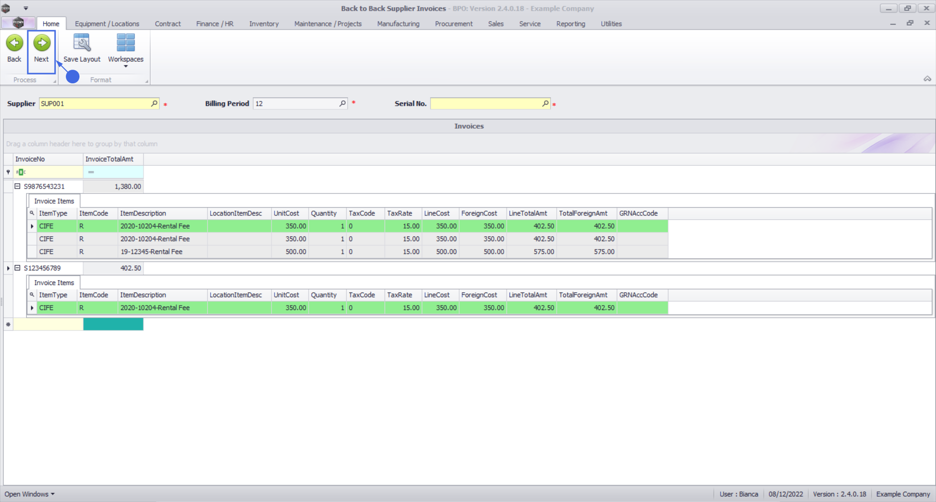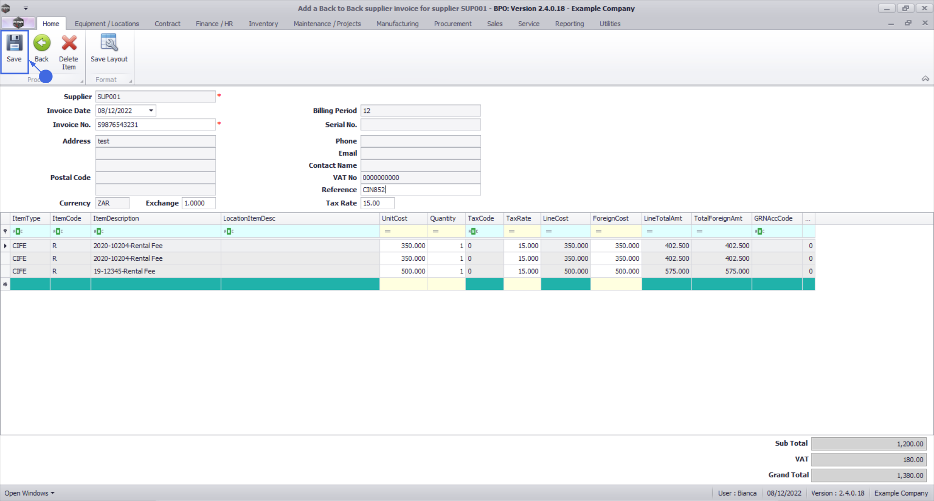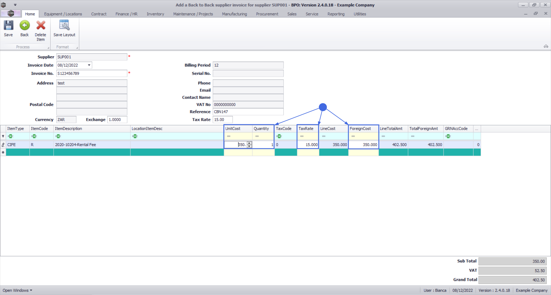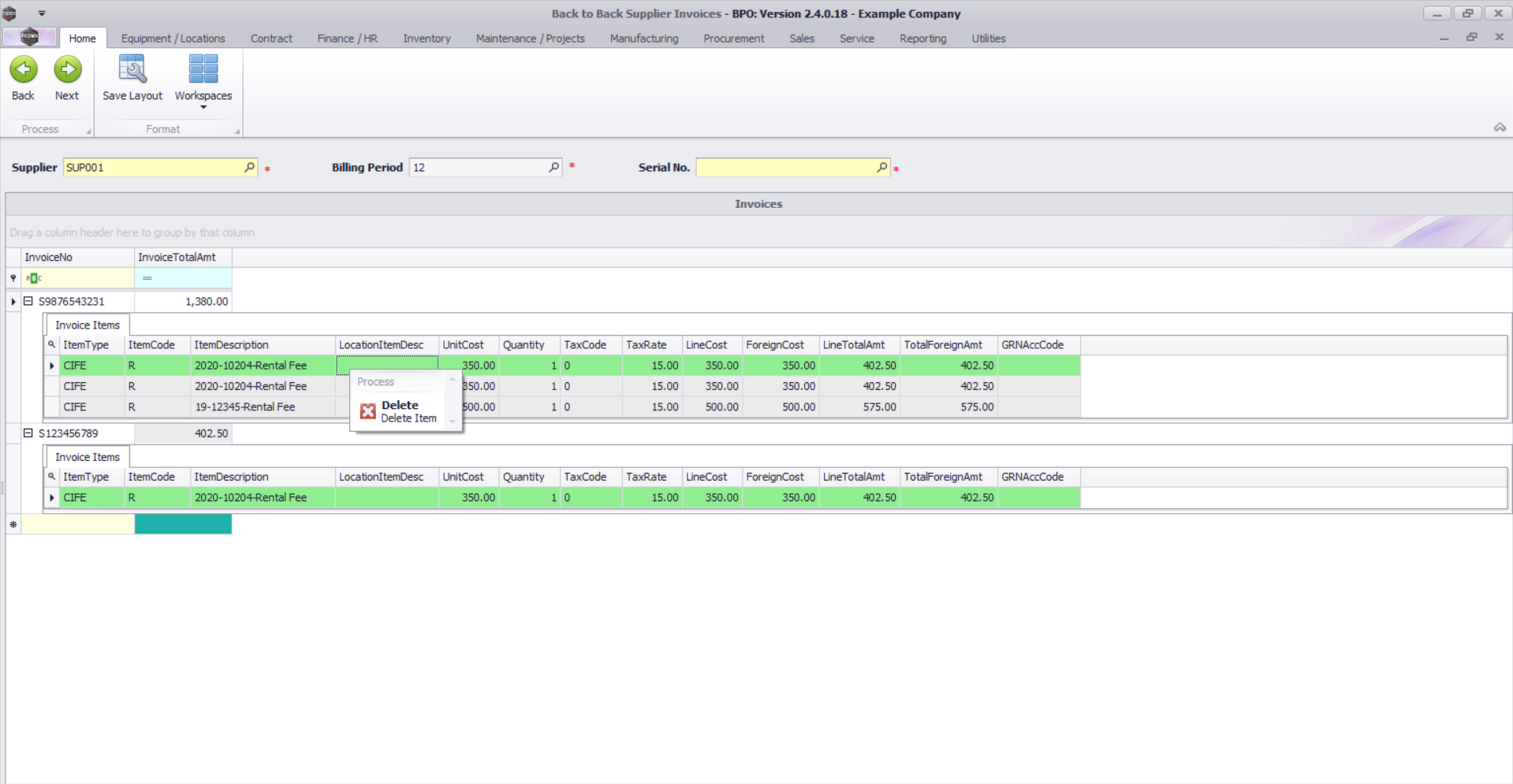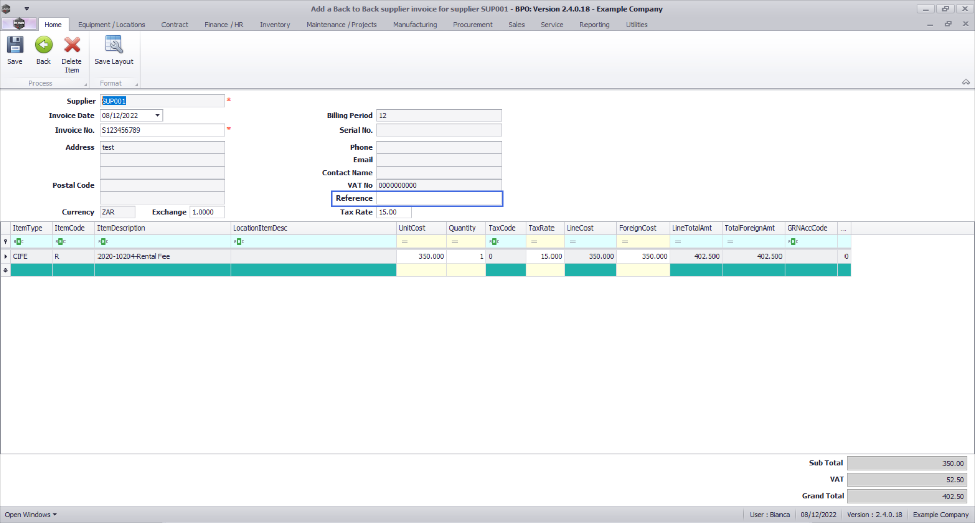 You will see the Back to Back Supplier Invoice maintain screen for the Invoice header you created previously. If you created multiple invoice headers, you will see the details for the first Invoice Header.